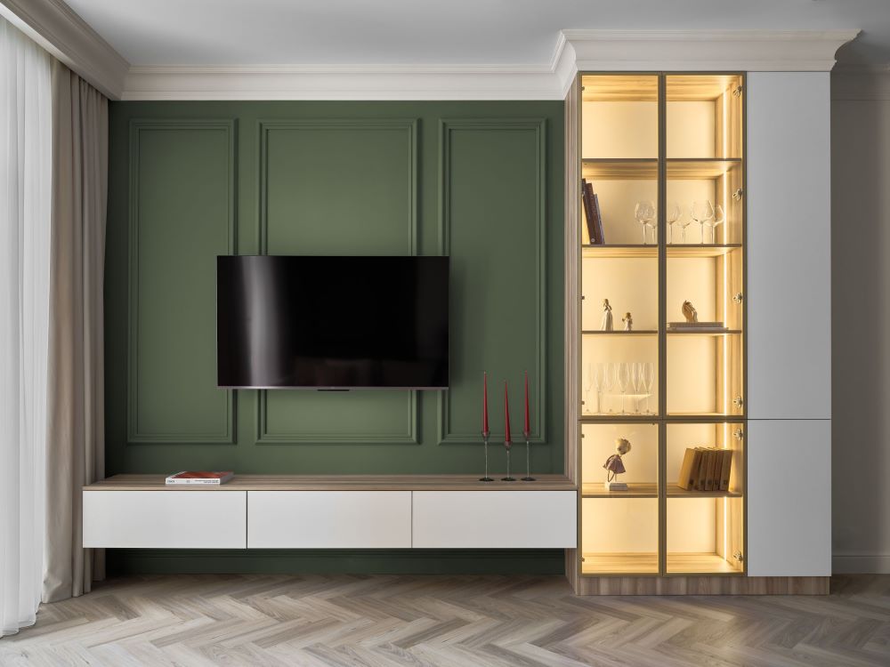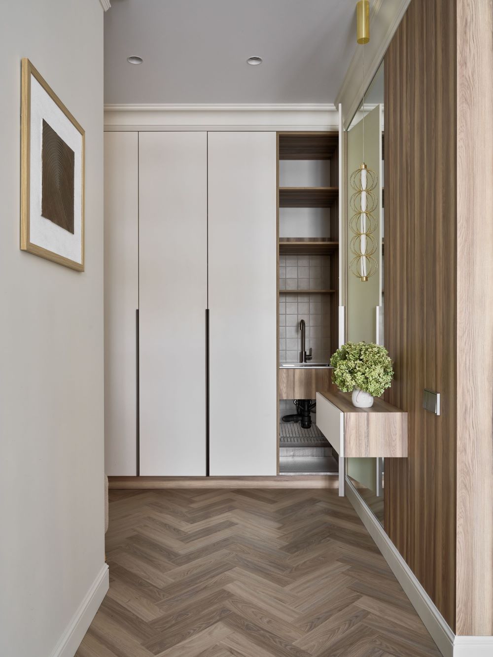 Классика этого интерьера читается в деталях — филёнках на стенах, широких карнизах и спокойной симметрии. Пространство звучит современно и легко, как продуманная композиция без лишних нот. Акцентная стена в цвете хаки добавляет интерьеру глубину и гармонично объединяется с тёплым деревом в отделке.